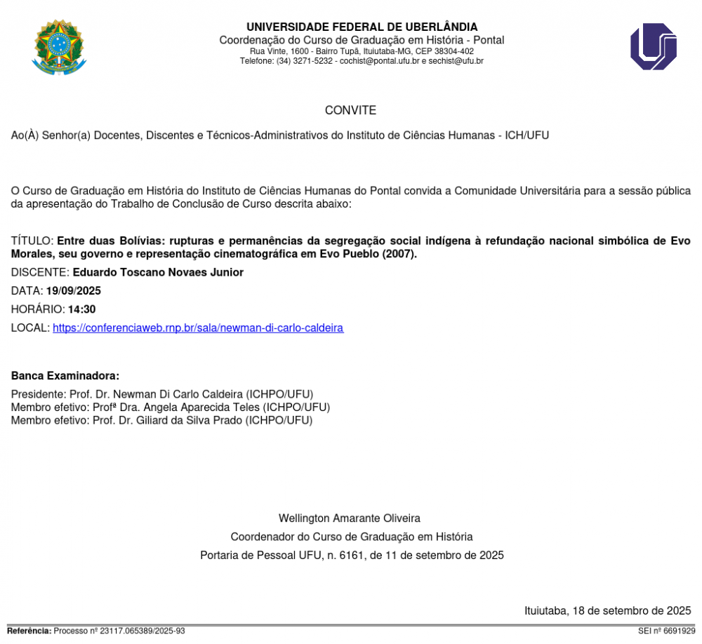 O Curso de Graduação em História do Instituto de Ciências Humanas do Pontal convida a Comunidade Universitária para a sessão pública da defesa do Trabalho de Conclusão de Curso descrita abaixo: