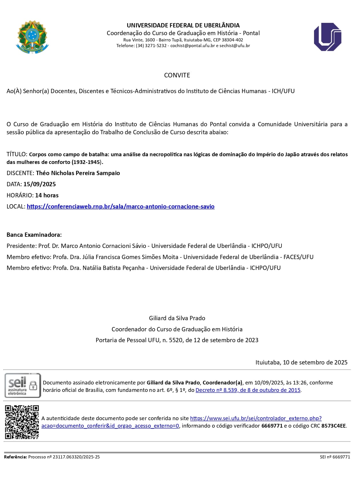 O Curso de Graduação em História do Instituto de Ciências Humanas do Pontal convida a Comunidade Universitária para a sessão pública da apresentação do Trabalho de Conclusão de Curso descrita abaixo: