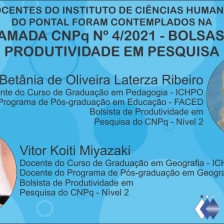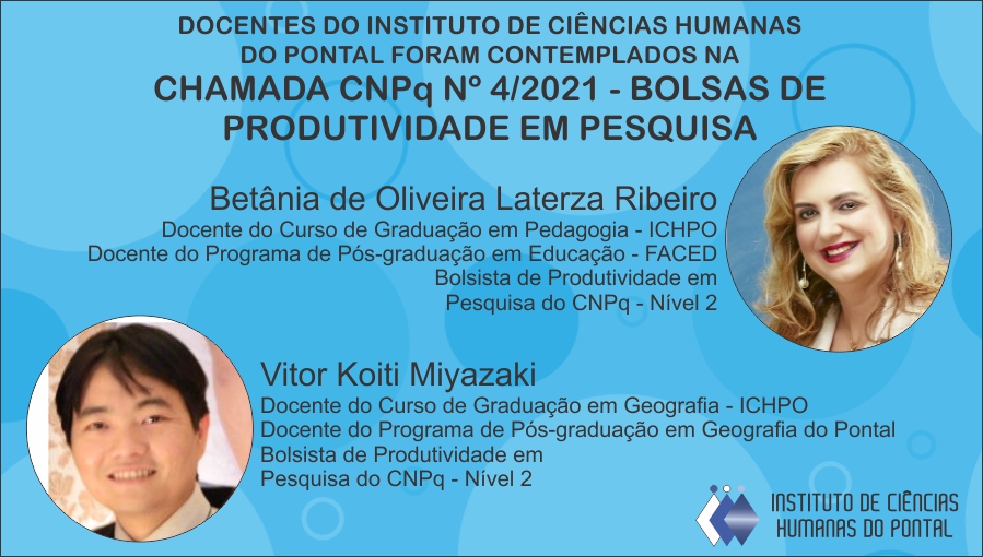 Dois docentes do Instituto de Ciências Humanas do Pontal foram contemplados na Chamada CNPq nº 4/2021 – Bolsas de produtividade em pesquisa: professora Betânia de Oliveira Laterza Ribeiro, do curso de Pedagogia; e professor Vitor Koiti Miyazaki, do curso de Geografia.