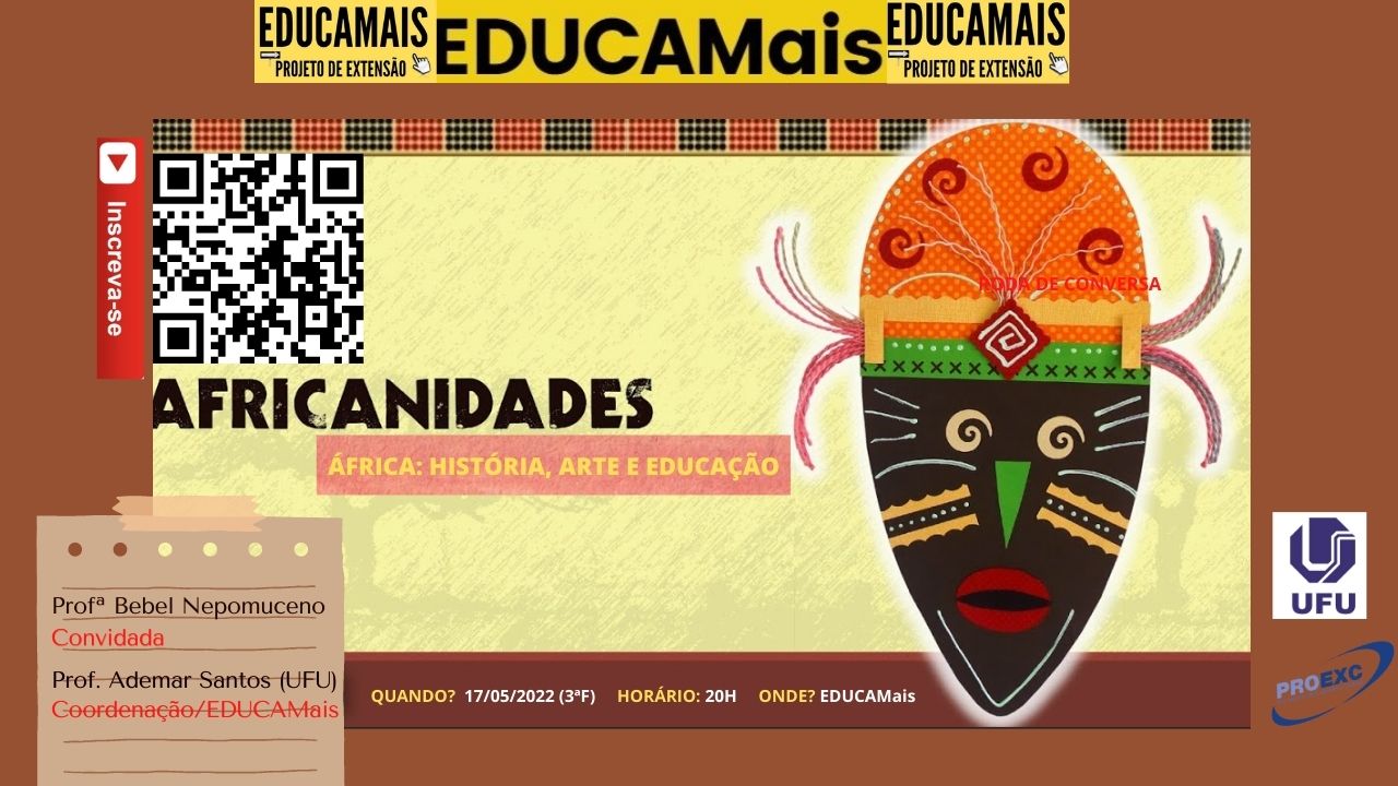 O Prof. Ademar Alves dos Santos, docente do curso de Pedagogia, do Instituto de Ciências Humanas do Pontal (ICHPO), da Universidade Federal de Uberlândia (UFU), convida toda comunidade acadêmica e demais interessados, para prestigiarem a roda de conversa remota (Live), com o tema “África: História, Arte e Educação”.